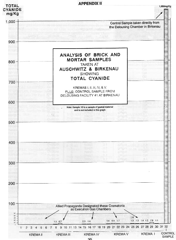 Books The Leuchter Report Appendix 2 Analysis of brick and mortar samples taken at Auschwitz and Birkenau showing total cyanide. Table of Contents | Appendix 3
